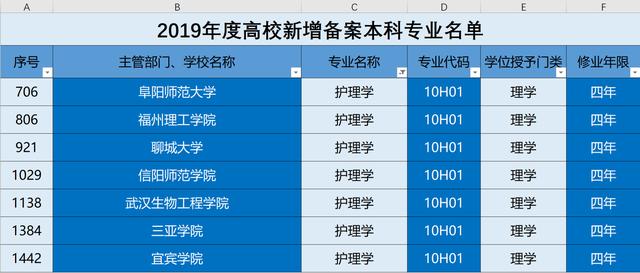 根据教育部发布的2019年度新增存案本科专业名单,我们可知以下7所高校新增护理学本科专业。